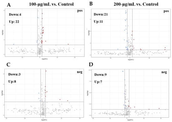 Volcano plot analysis of 100μg/mL CV-treated vs. the control in the positive (A) and negative (C) modes, and 200-μg/mL CV-treated vs. the control in the positive (B) and negative (D) mode.