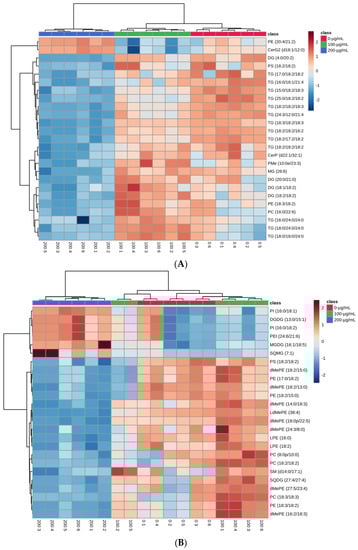 Compared with the control group, four lipids downregulated while 22 lipids upregulated for the 100-μg/mL CV treated group (Figure 5A), and 21 lipids downregulated while 11 lipids upregulated for the 200-μg/mL CV-treated group in the positive ion mode (Figure 5B). The significantly differential lipids are supplied in Supplementary Materials Table S1. In addition, in the negative ion mode, three lipids were downregulated with eight lipids upregulated (100-μg/mL CV-treated, Figure 5C) and nine lipids downregulated with seven lipids upregulated (200-μg/mL CV-treated, Figure 5D) in comparison with the control. The significantly differential lipids were supplied in Supplementary Materials Table S2. Furthermore, TG (18:2/17:2/18:2), TG (18:3/18:2/18:3), TG (18:2/18:2/16:2), TG (18:2/18:2/18:3), TG (25:0/18:2/18:2), TG (15:0/18:2/18:3), TG (24:3/12:0/21:4), TG (16:0/16:1/21:4), dMePE (18:2/13:0) and PE (18:2/15:0) are significantly downregulated with increasing CV concentrations in Supplementary Materials Table S3.