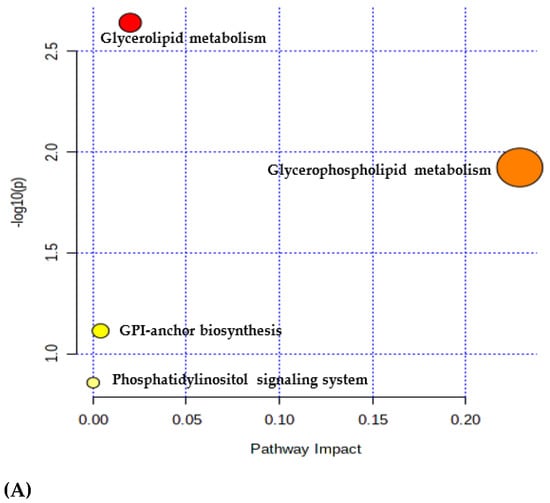 It was found that significant differential metabolites were involved in four metabolic pathways in the A. flavus mycelia. The glycerophospholipids metabolic pathway was a potential target metabolic pathway for CV intervention. Glycerophospholipids were key components of the cellular lipid bilayer, and their fatty acid compositions have important effects on membrane characteristics, such as membrane fluidity, transport triacylglycerols and cholesterol in the body and the formation of lipid rafts []. The glycerophospholipid bilayer was an integral cell membrane structure that played an important role in protecting cellular components from external influences and maintaining internal cellular biological functions without interference []. At the same time, glycerophospholipid metabolism was essential to the cell membrane dynamics []. Thus, the amounts of some kinds of glycerophospholipids induced by external factors may affect the overall cell metabolism. Moreover, the lipids associated with cell membrane homeostasis-related pathways, such as glycerophospholipid metabolism, were evidentially downregulated upon 200-μg/mL CV treatment.