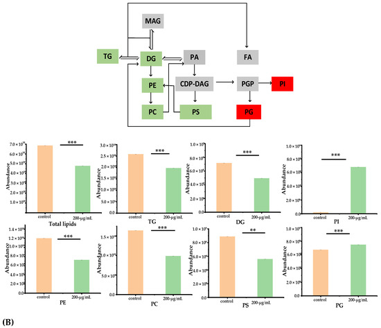 The decrease of the abundance of most of the glycerolipids and phospholipids of A. flavus indicated the inhibition of the lipid metabolism by CV. Neutral lipids in the fungi primarily included TGs, which were primarily responsible for the storage of free fatty acids, sterols and DG []. The general pattern of neutral lipid turnover in many fungi manifests itself as a mechanism of resistance to chemical fungicides [,,]. After treatment with 200-μg/mL CV, the abundance of neutral lipid (TG) was downregulated. Similar results were found for the decreased neutral lipids in Aspergillus parasiticus spear treated with propolis []. Phospholipids, which are the most abundant lipids in cells, account for 40–60% of the total lipids in eukaryotic cells []. After treatment with 200-μg/mL CV, the abundance of PC, PE and PS was significantly downregulated, whereas PI and PG were upregulated, indicating a blocking in the pathway of other phospholipids fractions from PI and PG.
