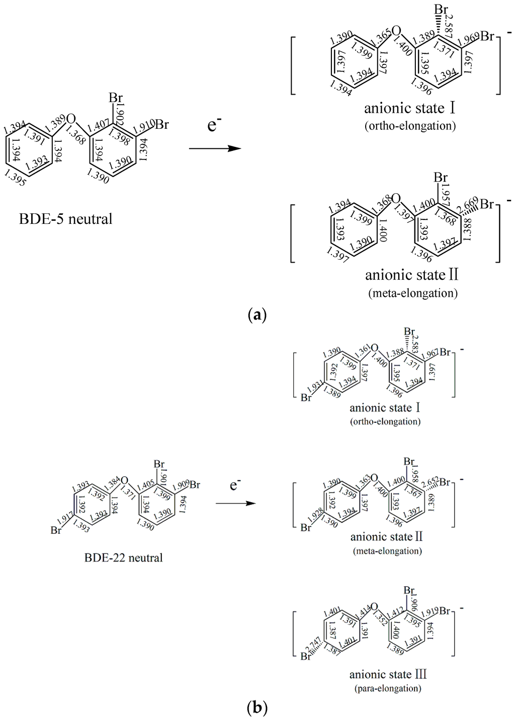 As is known, the dominant debromination pathway for PBDEs determined by experiments are expensive. Hu et al. used the optimized structures of anionic PBDEs to predict their dominant debromination pathway and the calculated results are consistent with the experimental data, which confirmed the reliability of the methods [].