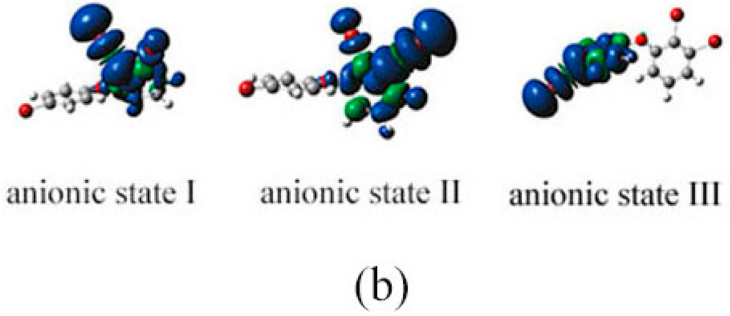 In gas phase, the energy order of three anionic states was I < II < III, with the relative energy of 0.0, 6.9 and 34.2 kJ·mol−1, respectively. This conclusion is in agreement with the previous study, which is focused on BDE-21 []. Figure 7a shows the relative energy diagram of the anionic states I, II and III, and the transition states between them. The conversion of configuration for states I and II should overcome the energy barrier 19.7 kJ/mol, while conversion of states II to III need 62.3 kJ/mol energy is to overcome the energy barrier. Anionic states I and II are the relatively stable species with lower energy, which indicated that debromination of BDE-22 may occur at either the meta- or the ortho-position.