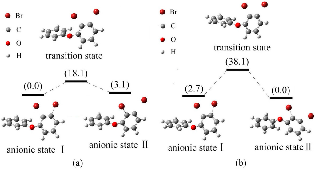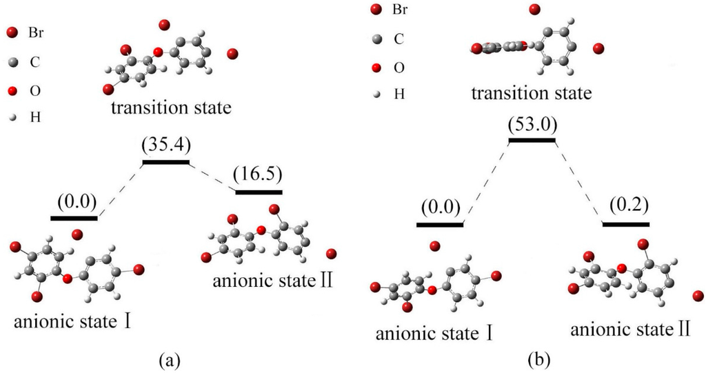 Figure 8a shows the relative energies of the anionic states I, II for BDE-5 and their transition state in gas phase. The energy of anionic state II is higher than that of anionic state I by 3.1 kJ/mol. The conversion of configuration for states I and II should overcome the energy barrier 18.1 kJ/mol. Anionic state I is the relatively stable species. In solution, the energy order of two anionic states for BDE-5 was II < I, with the relative energy of 2.7 and 0.0 kJ/mol, respectively. As shown in Figure 8b, the conversion of configuration for states I and II should overcome the energy barrier 38.1 kJ/mol. Anionic state II with low energy minima is the relatively stable species, and the debromination order of BDE-5 is meta- position > ortho- position in solution. This is compatible with the previous conclusion [].