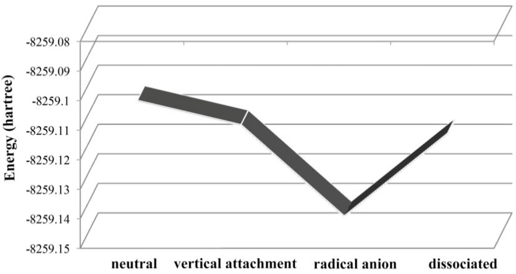 Interestingly, the C–O bond is so strong that there is no previous reports about the cleavage of this ether bond. The energy of each step for the debromination of BDE-22 is shown in Figure 11. When the neutral BDE-22 captures an electron, the stable anionic system with low energy minimum can be obtained (in gas-phase). Reaction profile for the electron-induced debromination of BDE-22 is shown in Figure 10. The anionic states with the optimized geometry has lower energy minimum than the vertical attachment energy, both of which capture an electron. Reaction profile for the electron-induced debromination of BDE-22 is shown in Figure 11. The radical anion with the optimized geometry has lower energy minimum than the vertical attachment energy, both of which capture an electron. The departing of bromine from the phenyl ring for BDE-22 needs 64.7 kJ/mol energy.