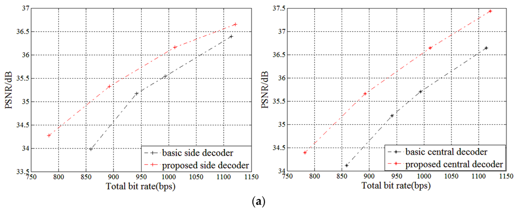 The structural similarity (SSIM) index [29] is a method for predicting the perceived quality of digital television and cinematic pictures, as well as other kinds of digital images and videos. SSIM is used for measuring the similarity between two images. The SSIM index is a full reference metric. SSIM is designed to improve on traditional methods, such as peak signal-to-noise ratio (PSNR) and mean squared error (MSE), which have proven to be inconsistent with human visual perception. At the end of each figure, the SSIM values for the sequences of Balloons, Kendo, Newspaper, Dancer and Pantomime are reflected in the Table 2, Table 3, Table 4, Table 5, Table 6, Table 7, Table 8, Table 9, Table 10 and Table 11; and Table 2, Table 4, Table 6, Table 8 and Table 10 are the SSIM values of five sequences for the side decoder; Table 3, Table 5, Table 7, Table 9 and Table 11 are the SSIM values of five sequences for central decoder. As we can see from the tables, the depth map formed by the proposed scheme and the SSIM values of the synthesized image with the uncompressed original images are close to one, and the values of the proposed scheme are greater than or equal to that of the comparison scheme. This indicates that the proposed scheme is better than the basic comparison scheme.