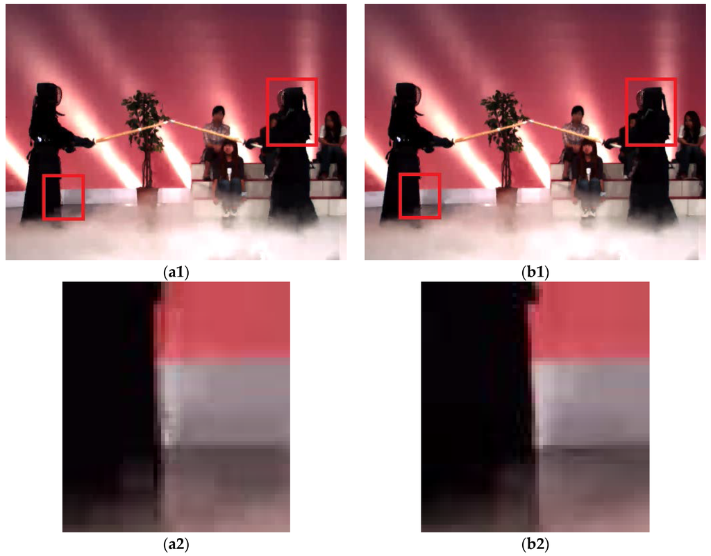 Furthermore, the advantages of the proposed scheme can be more clearly seen in Figure 9, Figure 10, Figure 11 and Figure 12, in which the subjective quality of the synthesized virtual viewpoint of Kendo and Dancer are presented, especially in some parts denoted by the red rectangle.