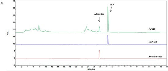 Analysis was performed on HPLC (Hitachi 5000 series system) equipped with UV wavelength detector set at 254 nm, and a reverse-phase column (Inert®, ODS-2, 250 mm × 4.6 mm, 5 μm) was used with a column oven at 40 °C. The mobile phase was composed of water (A) and acetonitrile (B) with a gradient as follows: 0–15 min 100% A; 15–40 min 100–80% A; 40–55 min 80–5% A; 55–75 min 50–0% A; 75–90 min 0% A; 90–91 min 0–100% A; 91–100 min 100% A. The flow rate was kept at 1.0 mL/min, and the injection volume was 10 μL. Identification of adenosine and HEA was determined by comparing retention times with the standards (Sigma-Aldrich, St. Louis, MO, USA). CCME was dissolved in 20-fold volumes of 95% ethanol and filtered through a 0.45 μm filter before HPLC analysis.