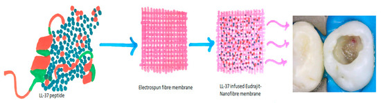 Pictorial representation of LL-37 in electrospun fiber membrane as a potential pulp capping agent.