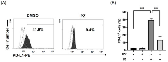 Effects of IPZ on radiation-increased PD-L1 expression on the surface of A549 cells. (A,B) IPZ (10 μM) was added to the culture medium at 1 h before X-ray irradiation at 6 Gy. After 4 days of culture, the cells were harvested for the analysis of cell-surface PD-L1 expression. (A) Representative histograms of PD-L1 expression on A549 cells are shown. The dotted and broken line histograms indicate isotype control and PD-L1 expression of non-irradiated cells, respectively. The filled black histogram indicates the PD-L1 expression of irradiated cells. Inset numbers indicate the percentage of PD-L1+ cells of 6 Gy-irradiated cells compared with an isotype control. (B) Data are presented as the mean ± SD of independent experiments. ** p < 0.01.