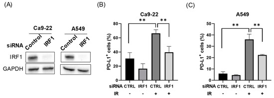 We next investigated whether IRF1 is involved in radiation-increased PD-L1 expression on the surface of IRF1-knockdown Ca9-22 and A549 cells (Figure 2A). Although IRF1 knockdown did not cause a significant decrease in PD-L1 expression under non-irradiated conditions, radiation-increased PD-L1 expression was significantly attenuated on the surface of both Ca9-22 and A549 cells (Figure 2B,C).
