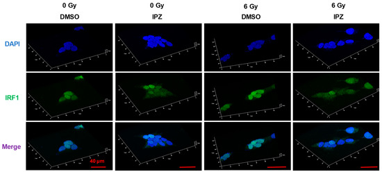 Effects of IPZ on the localization of IRF1 in Ca9-22 cells. IPZ (10 μM) was added to the culture medium at 1 h before irradiation at 6 Gy. After 24 h of culture, the treated Ca9-22 cells were harvested for the analysis of confocal images of IRF1. A 3D constructed image with maximum intensity is shown. Scale bar, 40 μm.