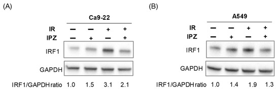 Effects of IPZ on IRF1 expression in irradiated Ca9-22 and A549 cells. (A,B) IPZ (10 μM) was added to the culture medium 1 h before irradiation at 6 Gy. The Ca9-22 (A) and A549 cells (B) were cultured for 24 and 48 h, respectively, and then harvested for western blot analysis. An image of a representative immunoblot is shown. GAPDH was used as a loading control.