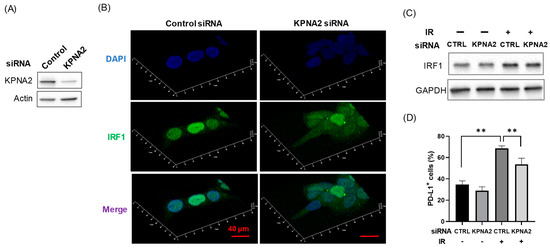 The above results suggest that KPNB1 mediates radiation-increased PD-L1 expression through upregulation and/or nuclear localization of IRF1. However, it is not clear whether nuclear localization of IRF1 is involved in radiation-increased PD-L1 expression. Therefore, the importance of nuclear localization of IRF in radiation-increased PD-L1 expression was investigated by focusing on KPNA2, which carries IRF1 into the nucleus [16]. Unsurprisingly, KPNA2-knockdown Ca9-22 cells showed less nuclear localization of IRF (Figure 5A,B). Importantly, although KPNA2 knockdown had a limited effect on radiation-increased IRF1 expression (Figure 5C), the radiation-increased PD-L1 expression of Ca9-22 cells was significantly attenuated (Figure 5D).
