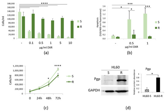 Characterization of HL60-R. (a) HL60-S and -R were cultured in the presence of different concentrations of DXR and counted after 24 h. (b) TUNEL assay was performed on HL60-S and -R treated for 24 h with DXR (0.5 and 1 μg/ml). (c) HL60-S and -R were cultured for 24, 48 and 72 h in their culture medium and counted every 24 h. (d) Western blot was performed on protein lysates using antibodies against Pgp. GAPDH was used as control of loading. A representative blot and densitometry obtained by ImageJ on three independent experiments ± SD are shown. * p < 0.05; *** p < 0.001; **** p < 0.0001.