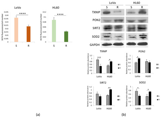 To unveil the mechanisms involved, we investigated the levels of the pro-oxidant thioredoxin-interacting protein (TXNIP) and some anti-oxidant proteins, i.e., paraoxonase (PON) 2, NAD-dependent deacetylase sirtuin (SIRT) 2 and superoxide dismutase (SOD) 2. We detected lower amounts of TXNIP and SOD2 and higher levels of PON2 in LoVo-R than -S, as detected by Western blot. On the contrary, HL60-R upregulate TXNIP, SOD2 and SIRT2, while PON2 is not modulated (Figure 2b), thus suggesting that the upregulation of SOD2 and SIRT2 might counterbalance the pro-oxidant activity of TXNIP. These results suggest that resistant cells accumulate lower amounts of ROS through a different regulation of pro- and antioxidant proteins.