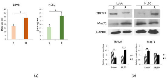 Mg homeostasis in DXR sensitive and resistant cells. LoVo and HL60 were cultured for 48 h in their culture medium. (a) Total intracellular Mg was measured. (b) Western blots were performed on protein lysates using antibodies against TRPM7 and MagT1. GAPDH was used as control of loading. A representative blot and densitometry obtained by ImageJ are shown. * p < 0.05; ** p < 0.01; *** p < 0.001.