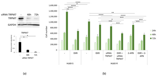 DXR cytotoxicity after inhibiting TRPM7. (a) HL60-R were transfected with a siRNA against TRPM7 for 48 and 72 h or with scrambled sequences as control (-). Western blot using antibodies against TRPM7 was performed on cell extracts as described in the methods. GAPDH was used as control of loading. A representative blot and densitometry obtained by ImageJ ± SD are shown. (b) HL60-R were silenced or treated with 2-APB (12.5 μM) to inhibit TRPM7. The cells were then treated or not with DXR (10 µg/ml). HL60-S treated or not with DXR were used as controls. The cells were counted after 24, 48 and 72 h. The experiment was performed three times in triplicate ± SD. * p < 0.05; ** p < 0.01; *** p < 0.001; **** p < 0.0001.