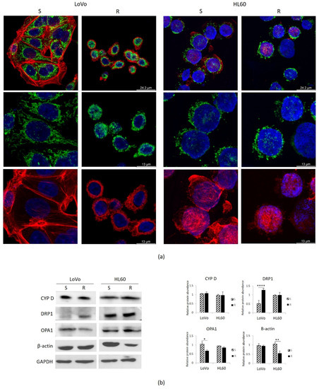 Initially, we compared the morphology of cells and mitochondria in LoVo-R vs. -S [10] and in HL60-R vs. -S. The cells were stained with rhodamine-conjugated phalloidin and DAPI to visualize the actin filaments and the nuclei, respectively. As previously described, LoVo-R and -S are markedly different in cell size and morphology [10,13] (Figure 5a). LoVo-S are spindle shaped, with a central nucleus. LoVo-R are small and round, their nucleus is central. No significant differences in cell morphology were observed in HL60-R and -S (Figure 5a). The cytoskeleton is less abundant in HL60-R and this corresponds to lower amounts of total actin as shown by Western blot (Figure 5b).