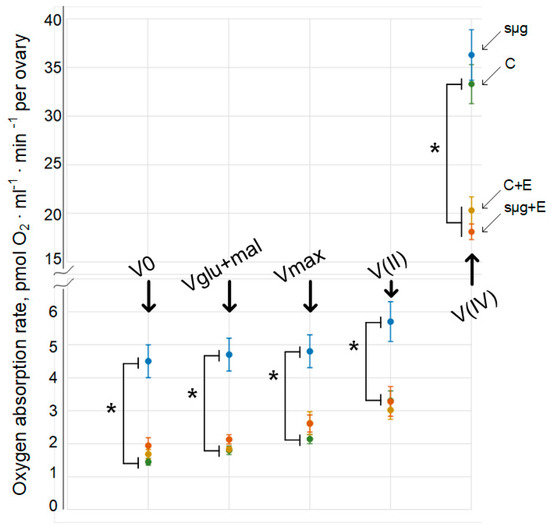 Respiration rate in ovaries after exposure to simulated microgravity conditions during the full cycle of oogenesis. C—control group, green line; sμg—fly group that had undergone the full cycle of oogenesis under simulated microgravity, blue line; C + E—control group that received essential lipids per os (500 mg per 1 kg medium), yellow line; sμg + E—fly group that received essential phospholipids and had undergone the full cycle of oogenesis under simulated microgravity, red line. V0—respiration rate of permeabilized cells; Vglu + mal—respiration rate after adding 10 mM glutamate + 5 mM malate; Vmax—maximum respiration rate after adding 2 mM ADP; V(II)—respiration rate after adding 0.5 μM rotenone (complex I inhibitor) and subsequent supplementation with 10 mM succinate (substrate of complex II); V(IV)—respiration rate after adding 5 μM antimycin (complex III inhibitor) and subsequent supplementation with 0.5 mM TMPD + 2 mM ascorbate (artificial substrates of complex IV). * p < 0.05 in comparison with the control group.