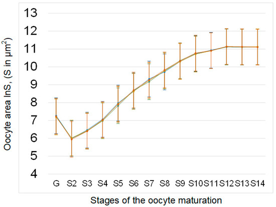 Immediately after extirpation, the ovaries were placed on a glass slide and photographed under transmitted light under an Olympus IX73 inverted microscope (Olympus Corporation, Tokyo, Japan) using 10× magnification. The following stages were determined: germarium—G, S2, S3, S4, S5, S6, S7, S8, S9, S10, S11, S12, S13 and S14, in accordance with [28]. The area was counted in µm2 using ImageJ open source software (version for Windows, https://imagej.net/Fiji, accessed on 30 April 2021). Due to the significant increase in the area of oocytes from stage S2 to S14, the data are presented on a logarithmic scale (lnS).