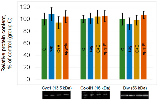 Relative contents of proteins participating in mitochondrial respiration. Cytochrome c-1 (CG4769), 13.5 kDa, is located between complexes III and IV; cytochrome c oxidase (CG10396), 16 kDa, is the protein of complex IV; and blw (bellwether), 56 kDa, is the subunit of ATP synthase. The color coding of the groups is the same as above (C—green, sμg—blue; C + E—yellow; sμg + E—red). Typical Western blots for each protein are shown under the corresponding part of the histogram.