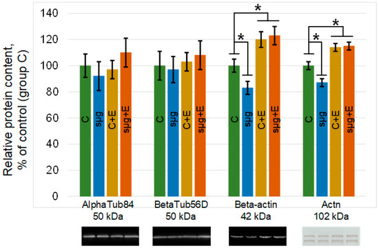 Relative contents of cytoskeletal proteins in Drosophila melanogaster ovaries. AlphaTub84, alpha-tubulin84D and alpha-tubulin84B, 50 kDa, are components of the tubulin heterodimer; betaTub56D, beta-tubulin, 50 kDa, is a component of the tubulin heterodimer; Beta-actin, Act57B and Act87E, 42 kDa, are components of the microfilament network; Actn, alpha-actinin, 102 kDa, is a component of the microfilament network. The color coding of the groups is the same as above (C—green, sμg—blue; C + E—yellow; sμg + E—red). * p < 0.05 in comparison with the control group C. Typical Western blots for each protein are shown under the according part of the histogram.