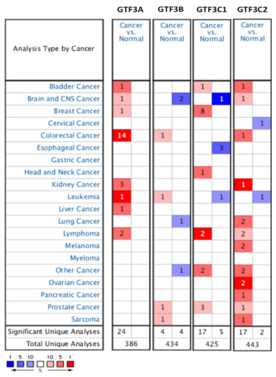 GTF3 gene expression patterns in different cancers (ONCOMINE). The expressions of GTF3 family genes in cancer patients were compared to that of normal patients. A reduction in a gene’s rank percentile is represented by the color gradient. The thresholds applied were a p-value of <0.05, a multiple of change of two-fold, and a percentile gene rank of <10% in cancer versus normal cases.