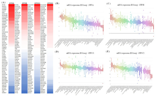 Expressions of members of GTF3 family genes in colorectal cancer cell lines in the CCLE platform. (A) The CCLE database was used to plot a heatmap for all rows representing colorectal cancer cells based on expression levels of GTF3 family genes. GTF3 expression levels varied among colorectal cancer cell lines. Red indicates overexpression (top column), and blue indicates under-expression (bottom column) in cancer cells. (B) GTF3A expression in colorectal cancer cell lines. (C) GTF3B expression in colorectal cancer cell lines. (D) GTF3C1 expression in colorectal cancer cell lines. (E) GTF3C2 expression in colorectal cancer cell lines.