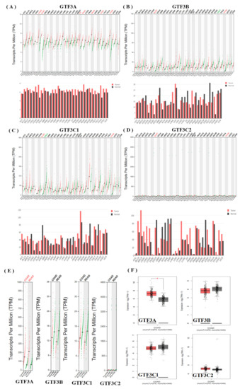 Oncomine is an online database that provides information on microarray cancer data. ONCOMINE (https://www.oncomine.org/, accessed on 25 February 2021) and GEPIA (http://gepia.cancer-pku.cn/, accessed on 25 February 2021) cancer databases also provide details on gene expression in cancer and normal samples [19,25]. The ONCOMINE and GEPIA analyses in this study were used to determine the expression levels of individual members of the GTF3 family in CRC. Statistical testing was performed using Student’s t-test comparisons. The p-value was used to make decisions on differences in the gene expressions of GTF3 family members between normal controls and CRC samples. This study used the parameter threshold p-value of <0.05, multiple of change of 2, and top 10% gene ranking as we previously described [26,27,28,29,30].