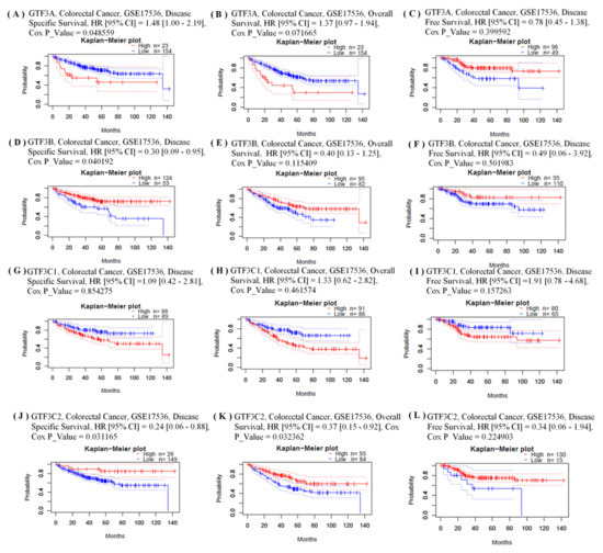 Kaplan–Meier survival curve comparing high and low expressions of genes of members of the GTF3 family in colorectal cancer using the PrognoScan database with GSE17536 cohort data (n = 177). The Kaplan–Meier survival curve shows the correlation of disease-specific survival (DSS), overall survival (OS), and disease-free survival (DFS) of colorectal cancer patients with high and low expression levels of GTF3 family members.