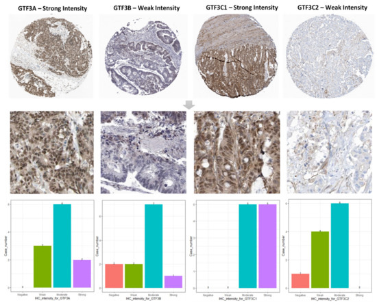 To determine the prognostic roles of mRNA members of GTF3 family genes in CRC, this study used the PrognoScan (http://dna00.bio.kyutech.ac.jp/PrognoScan/, accessed on 25 February 2021) and HPA databases (www.proteinatlas.org, accessed on 25 February 2021) [32]. The PrognoScan database was used to generate survival plots, with a p-value threshold of 0.05 [33]. The HPA database provides a wealth of information on sequences, pathology, expressions, and distributions in various cancer tissues. The first version of this database contained more than 400,000 high-resolution images corresponding to more than 700 antibodies to human proteins [34]. This study analyzed the differential status of protein expressions and localization of select members of GTF3 family genes in CRC tissue using this database.