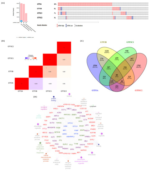 Alterations in gene expressions can occur as a result of amplification, deletion of genes, or irregular transcription regulation. Furthermore, altered gene functions can also occur due to gene mutations. Therefore, we analyzed these genomic changes of the GTF3 gene family that were differentially expressed using the cBioPortal (Figure 6) and found that genetic alteration rates of GTF3 family genes were in the order of GTF3A (26%), BRF1/GTF3B (6%), GTF3C1 (7%), and GTF3C2 (5%) (Figure 6A). We also calculated mRNA expression correlations among GTF3 gene family members and found that GTF3A was negatively correlated with GTF3B, GTF3C1, and GTF3C2; GTF3B was positively correlated with GTF3C1 and GTF3C2; and GTF3C1 was positively correlated with GTF3C2 (Figure 6B).