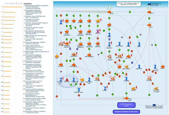 GTF3A differentially expressed genes pathway developed by MetaCore. Experimental data from TCGA were linked to and visualized on pathway maps as thermometer-like figures. To study the gene networks and signaling pathways that could be affected by the chosen genes, we exported genes expressed with GTF3A and then uploaded them to the MetaCore platform for a path analysis. The MetaCore pathway analysis indicated that the “DNA damage_ATM/ATR regulation of G2M checkpoint cytoplasmic signaling”-related pathway was correlated with colorectal cancer development.