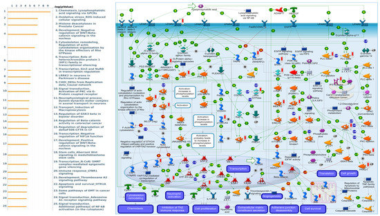 GTF3B differentially expressed genes pathway developed by MetaCore. Experimental data from TCGA were linked to and visualized on pathway maps as thermometer-like figures. To study the gene networks and signaling pathways that could be affected by the chosen genes, we exported genes expressed with GTF3B and then uploaded them to the MetaCore platform for a path analysis. The MetaCore pathway analysis indicated that the “chemotaxis lysophosphatidic acid signaling via GPCRs”-related pathway was correlated with colorectal cancer development.