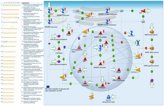 GTF3C1 differentially expressed genes pathway developed by MetaCore. Experimental data from TCGA were linked to and visualized on pathway maps as thermometer-like figures. To study the gene networks and signaling pathways that could be affected by the chosen genes, we exported genes expressed with GTF3C1 and then uploaded them to the MetaCore platform for a path analysis. The MetaCore pathway analysis indicated that the “regulation of lipid metabolism_Regulation of lipid metabolism via LXR, NF-Y, and SREBP”-related pathway was correlated with colorectal cancer development.