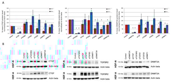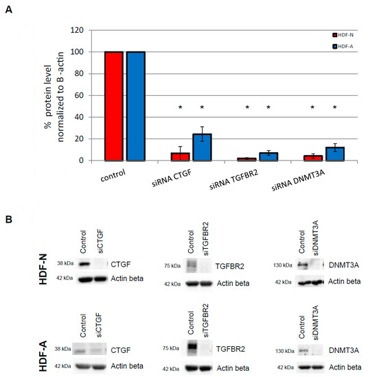 Verification of specificity of siRNA on CTGF, TGFBR2, and DNMT3A proteins in neonatal (HDF-N) and adult (HDF-A) human dermal fibroblasts. Cells treated with control siRNA were considered as an experimental control (with a value of 100%) in comparison with the protein levels in cells treated with various specific siRNAs. Protein levels were normalized to Actin β. (A) The protein levels of CTGF, TGFBR2, and DNMT3A after silencing with specific siRNAs are significantly reduced in HDF-N and HDF-A cells (* p-value < 0.05). Error bars represent standard error of the mean. (B) Representative immunoblots show the specificity of analyzed proteins: significantly reduced protein level in cells treated with various specific siRNAs in the evaluated cell lines.