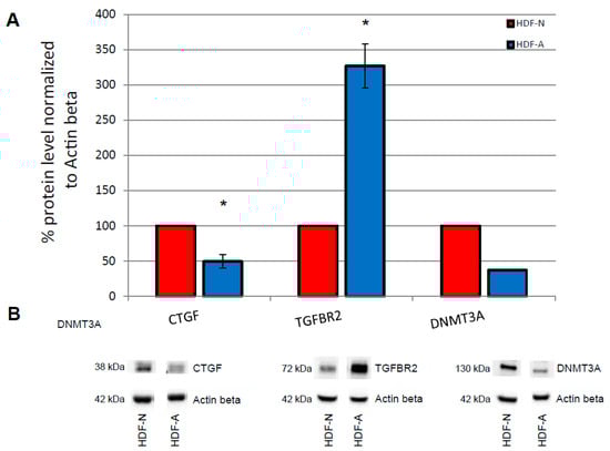 Endogenous CTGF protein level was 52% lower in the HDF-A cells compared to HDF-N cells (p = 0.017). Similarly, endogenous DNMT3A protein level was 63% lower in the HDF-A cells than in the HDF-N cells. In contrast, endogenous TGFBR2 protein level was 227% higher in the HDF-A cells compared to the HDF-N cells (p = 0.023) (Figure 2).