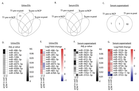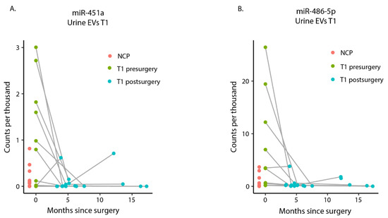 2.6. miR-451a and miR-486-5p Are Highly Expressed in Presurgery Urinary EVs among T1 Patients