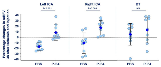 Relative changes in mBFV recorded in the three afferent arteries of the circle of Willis 3 h after ischemia and treatment. pMCAo produced an amputation of the vascular network, then the left ICA showed a drop in mBFV in PBS-treated mice. PJ34-treated mice did not show this drop; this was evocative of the establishment of the collateral supply through the cortical anastomoses between neighboring cerebral territories. In the right ICA, mBFV remained stable after ischemia, whereas PJ34 produced increased mBFV in both blood rerouting through the circle of Willis and then the cortical anastomoses. In the BT, no significant modification was recorded in PBS- and PJ34-treated mice (not significant—NS; n = 9 mice per group).
