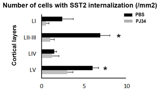 PBS-treated P7 mice show increased numbers of cells showing SST2 internalization in the rostral cerebral cortex 48 h after PMCAo compared to PJ34-treated mice. The graph is showing the quantifications (mean ± SEM) of the densities of cells in the different cortical layers in PBS- (n = 3) and PJ34-treated (n = 4) pups at the +0.14 bregma level. A single confocal Z plane (20×) was used for the quantification. Note that, due to the very high density of the SST2 staining in layer VI, punctate corresponding to SST2 internalization was difficult to attribute to a specific single cell. Layer VI counting is therefore not reported in the graph. Asterisk is indicated for * p values < 0.05.