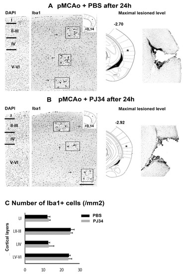Numerous Iba-1-positive cells with both ramified and/or ameboid morphology were observed in all ipsilateral cortical layers of PBS- and PJ34-treated mice 24 h after pMCAo (Figure 4A,B). Their number was not different between PBS and PJ34 treatment at the rostral level (+0.14 mm). At the caudal level (−2.70 and −2.92 mm, respectively), a great number of Iba-1+-macrophages was observed around the lesion (Figure 4C).