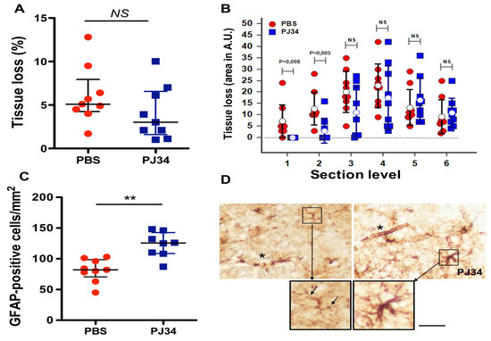 Tissue loss and astrocyte features eight days after ischemia were measured on the same mice used for the measurements of mBFV. (A): Total tissue loss in PBS- and PJ34-treated mice. (B): Tissue loss measured on six different brain levels (bregma 0.86 (1), 0.14 (2), −0.80 (3), −1.50 (4), −2.30 (5), and −2.92 (6) mm) from rostral to caudal brain. Whereas total tissue loss was not significantly reduced, a significantly reduced area of tissue loss was observed at the level of the two first sections (anterior striatum). Open circles represent the mean ± SD (black, PBS; blue, PJ34). NS = non-significant. (C): Quantification of GFAP-positive astrocytes in the cortex (bregma +0.14 mm) in PBS (red) and PJ34-treated (blue) mice. Data are plotted as dots with median and interquartile range, ** p < 0.01. (D): Representative images of astrocyte morphology in a PBS-treated and PJ34-treated mouse showing loss (in PBS) and presence of GFAP-stained astrocytes endfeet (black star) respectively, and a few astrocytes with clamatodendrotic features (black arrows in enlarged panel). In a PJ34-treated mouse, stellar GFAP-stained astrocytes with more or less thick processes (enlarged panel) were observed. Bar represents 20 µm.