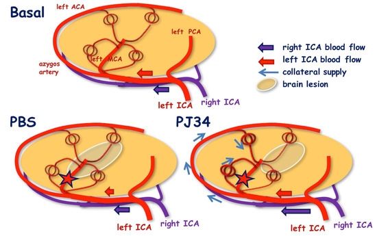 Schematic representation summarizing blood flow re-routing after pMCAo and treatment. After PBS, blood flow is reduced in the left ICA with no collateral flow. After PJ34, blood flow remained stable in the left ICA and increased in the right ICA, leading to collateral supply via the azygos artery. Red star represents the location of pMCAo, i.e., after the first side branches of the MCA.