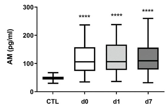 In healthy control subjects, AM levels (median, Q1-Q3) were 47.7 pg/mL (43.3–52.8) (Figure 1). In hemorrhagic stroke patients, AM levels were 105.8 pg/mL (74.6–157.8) (d0), 106.4 pg/mL (79.3–166.4) (d1), and 109.7 pg/mL (79.2–154.4) (d7), all of them very significantly higher (p < 0.0001), about a 2.5-fold increase, than those obtained in healthy subjects (Figure 1). No differences in AM levels were observed between sexes (p = 0.11). Since the age of the patients did not coincide with that of the healthy volunteers, we investigated whether there was a correlation between AM levels and age. A Spearman’s analysis indicated that there is no significant correlation (r = −0.21, p = 0.09).
