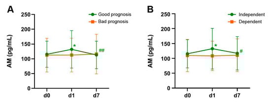 Evolution of AM levels through time in patients with favorable (green lines) or unfavorable (orange lines) outcome, as measured by the NIHSS (A) and the mRankin (B) scales. Patients with a positive evolution of the disease were characterized by an initial elevation of AM levels from d0 to d1 followed by a decline to initial levels by d7. Patients with unfavorable outcome had no significant changes in AM levels. Bars represent the mean and SD of all patients in the group. *: p < 0.05 vs. d0; #: p < 0.05 vs. d1; ##: p < 0.01 vs. d1.