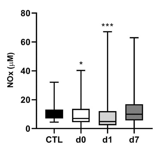 Circulating NOx levels in hemorrhagic stroke patients. NOx levels were measured in the same healthy volunteers (CTL) and hemorrhagic stroke patients as in Figure 1. In patients, blood samples were taken on admission (d0), 24 h later (d1), and at hospital discharge (d7). Box plots represent the interquartile range with the median as a horizontal line. Whiskers encompass the maximum and minimum values of the population. *: p < 0.05; ***: p < 0.001 vs. CTL.