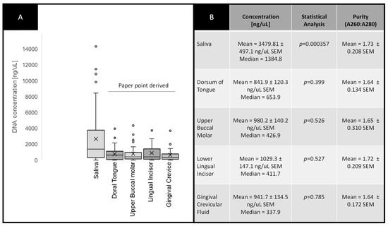 Analysis of DNA isolation. (A) Box-and-whisker plot of DNA concentrations from saliva and paper point sampling sites (dorsal tongue, upper buccal molar, lingual incisor, gingival crevice) demonstrates higher averages among saliva samples (p = 0.000357). (B) Average DNA concentrations from paper point sampling sites were not significantly different from one another (p = 0.399).