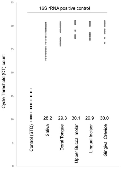 In order to verify the presence of bacterial DNA from each sample, real time quantitative polymerase chain reaction (RT-qPCR) was performed using 16S rRNA (Figure 2). These data demonstrated that all samples harbored DNA of sufficient quantity and quality for this analysis. The cycle threshold (CT) average count for the study samples was significantly higher (CT range: 28.2–30.1) than the average CT count for the known bacterial standards at 10 ng/μL, 5 ng/μL, and 2 ng/μL (CT average 12.86) (p = 0.00018), but not significantly different from one another (p = 0.513).