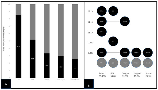 Screening for S. noxia (SN) using qPCR for all sites from each patient revealed a total of n = 62/235 sites or 26.3% harbored this organism (Figure 3). More specifically, the site most commonly associated with an SN-positive result was saliva either alone or in combination with one or more sites, n = 23/27 or 85.18% (Figure 3A). The second most commonly associated site with SN-positive results was GCF either alone or in combination with saliva or other sites, n = 14/27 or 51.5%. Positive results for the other sites either alone or in combination with saliva or GCF were similar among the tongue (33.3%), lower lingual incisor (29.6%), and upper buccal molar (25.9%) (Figure 3B). Logistic regression of each site as a predictor of positive outcome for other sites revealed a strong odds ratio (OR = 17.8) between saliva and GCF, which was more significant than associations between any other combinations of sites (p = 0.00219).