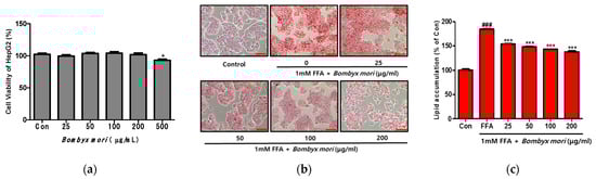 Effects of Bombyx mori (SW) on the viability and intracellular lipid accumulation in FFA-induced HepG2 cells. Lipid droplets in HepG2 cells were dyed red (magnification 200×). (a) Cell viability of HepG2 cells. * p < 0.05 vs. Con. (b) Oil Red O staining images of HepG2 cells treated with 1 mM free fatty acids (FFA) and exposed to various concentration of SW with 1 mM FFA for 24 h. (c) Quantitative lipid accumulation of Oil Red O contents at 500 nm. Control (Con) cells were incubated with 1% fat-free bovine serum albumin. Data represent means ± SD of three independent experiments. ### p < 0.001 vs. Con; *** p < 0.001 vs. FFA.